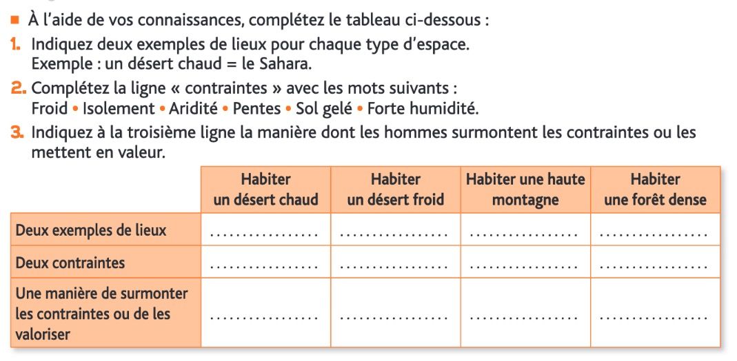• Recopier le tableau ci-dessous et le compléter à l'aide de la vidéo, de la carte et du manuel aux pages :